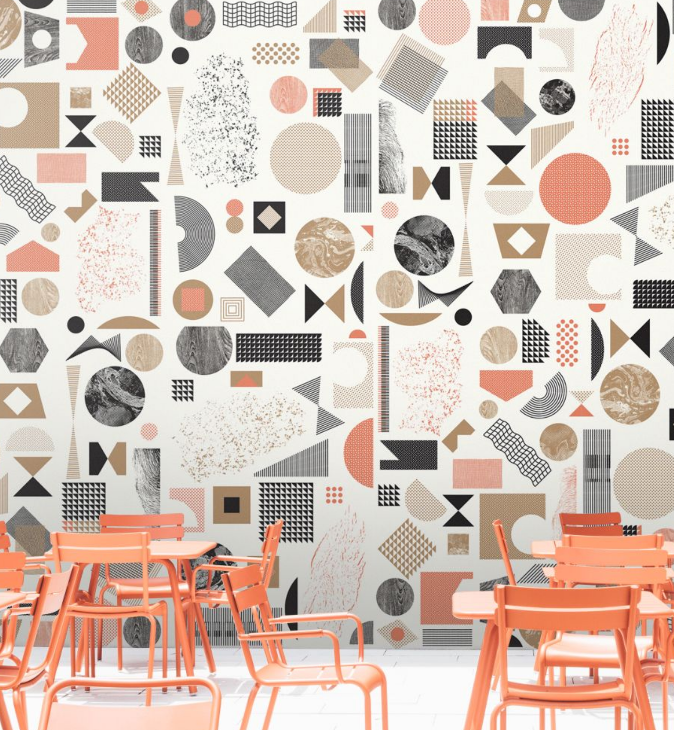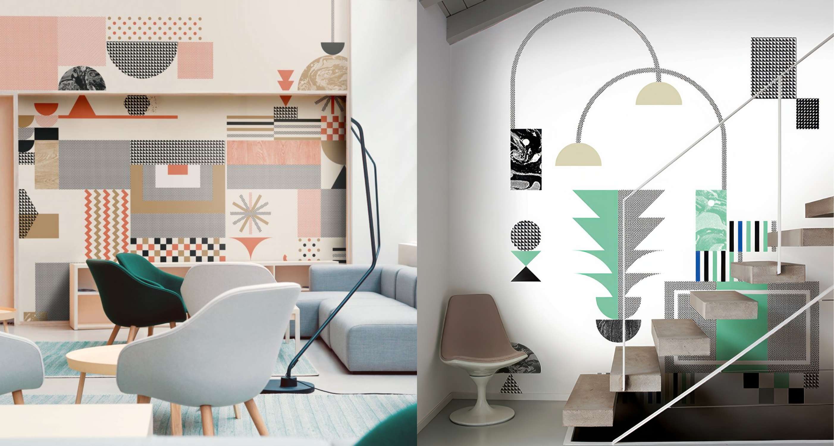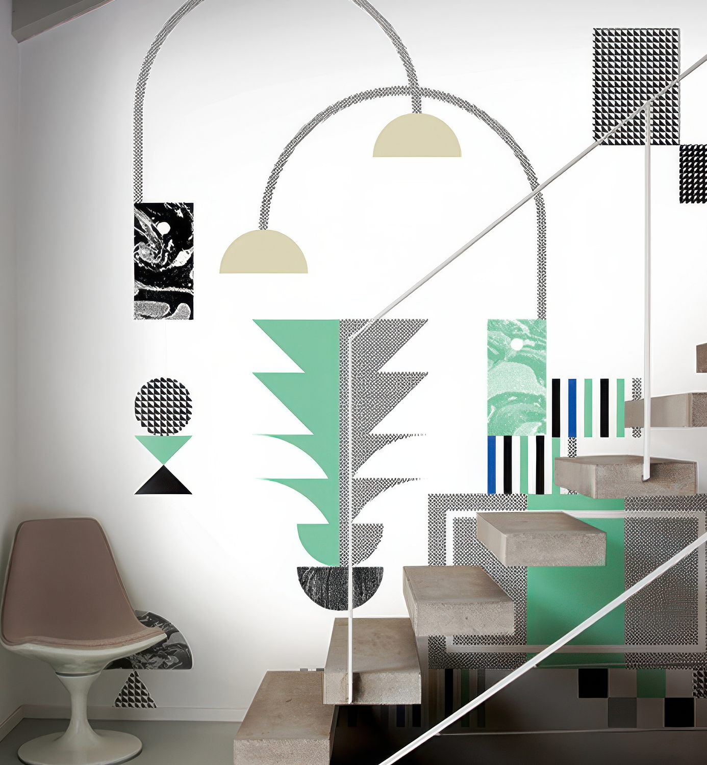 Grazie all’uso di un linguaggio prettamente geometrico,l’estrema astrazione in forme semplici ricostruisce spazi,oggetti, situazioni che diventano elementi decorativipiù o meno riconoscibili a seconda della distanza dell’osservatore.