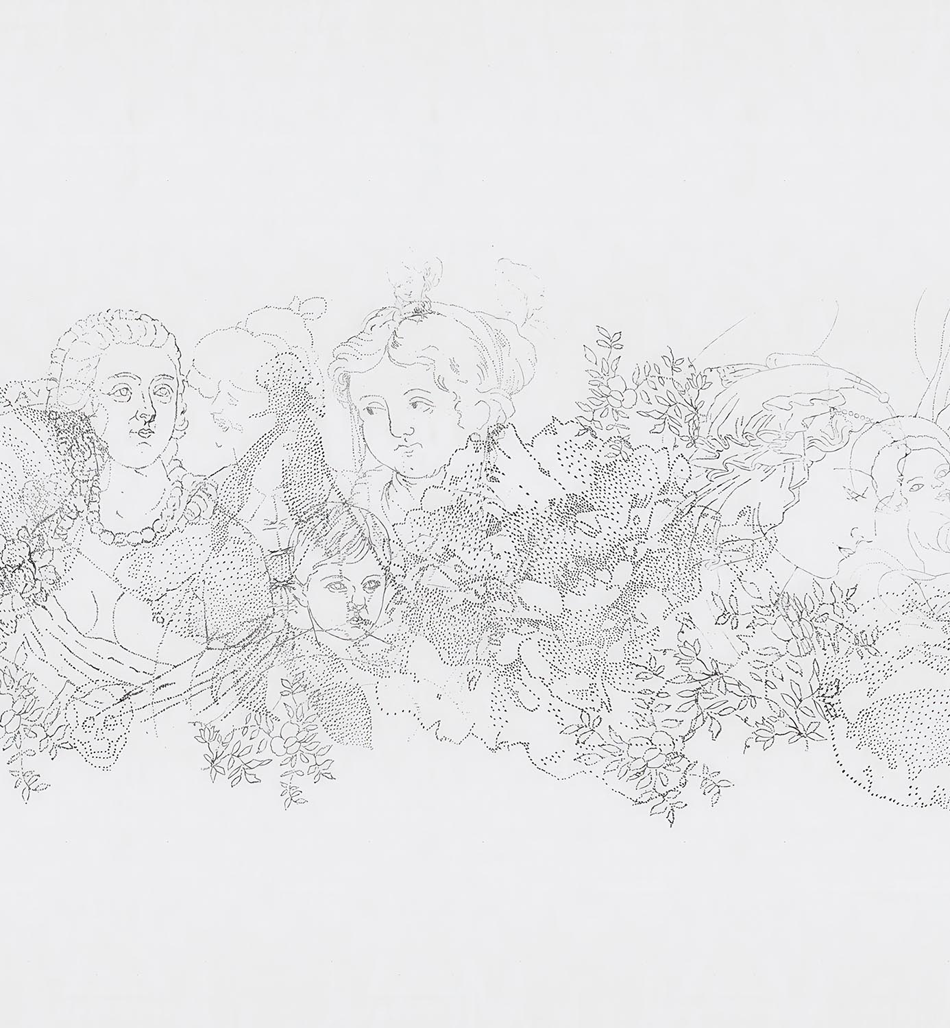 The wallpapers of this collection are inspired by a technique called Spolvero (pouncing). Used in wall painting as well as ceramic decoration for transferring an image from one surface to another. Pouncing requires the use of a pierced paper and coal powder, that leaves an outlined image on the surface.
