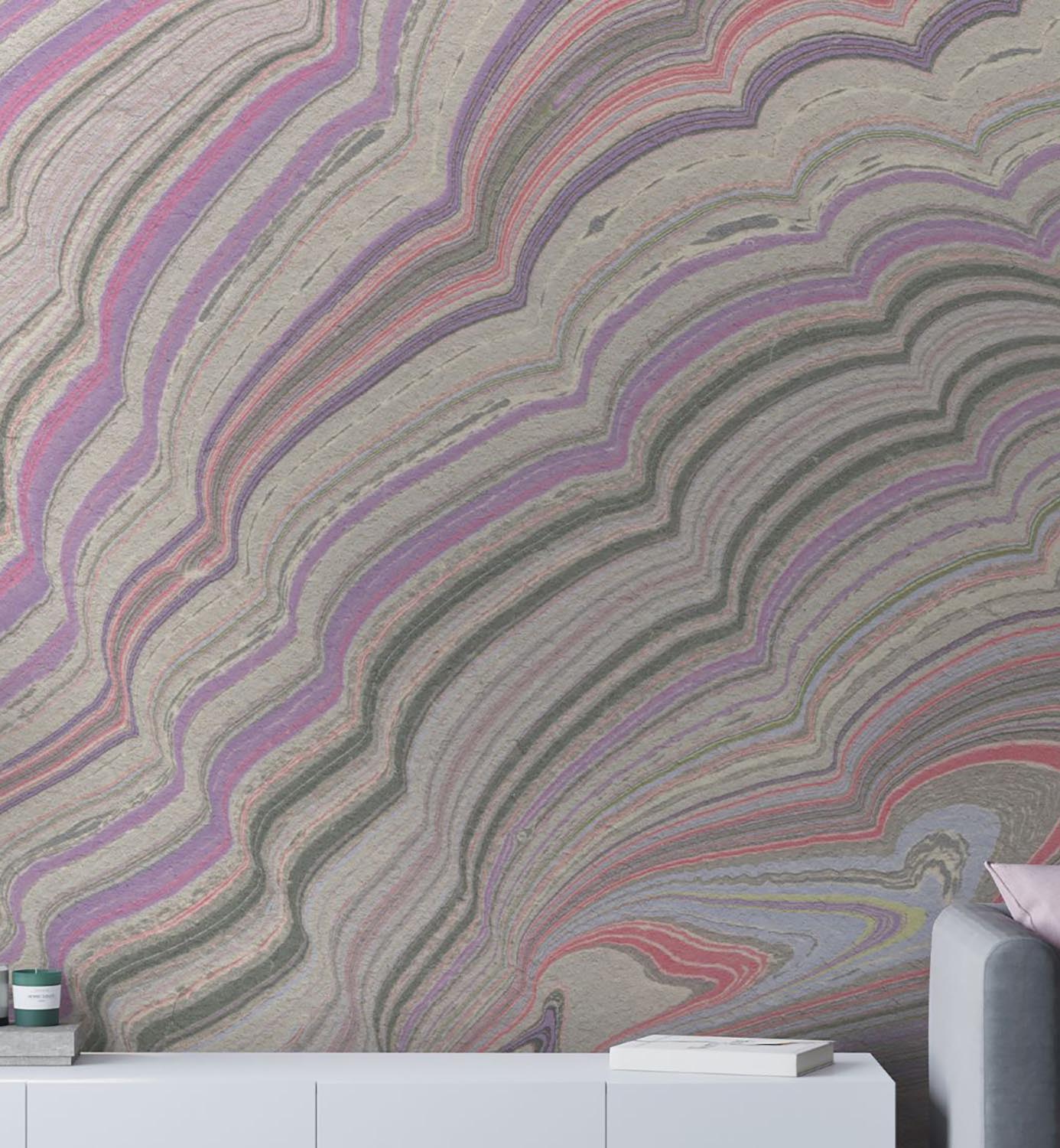 Soft lines and waves created using the traditional marbled paper technique that stretches along the wall, resembling