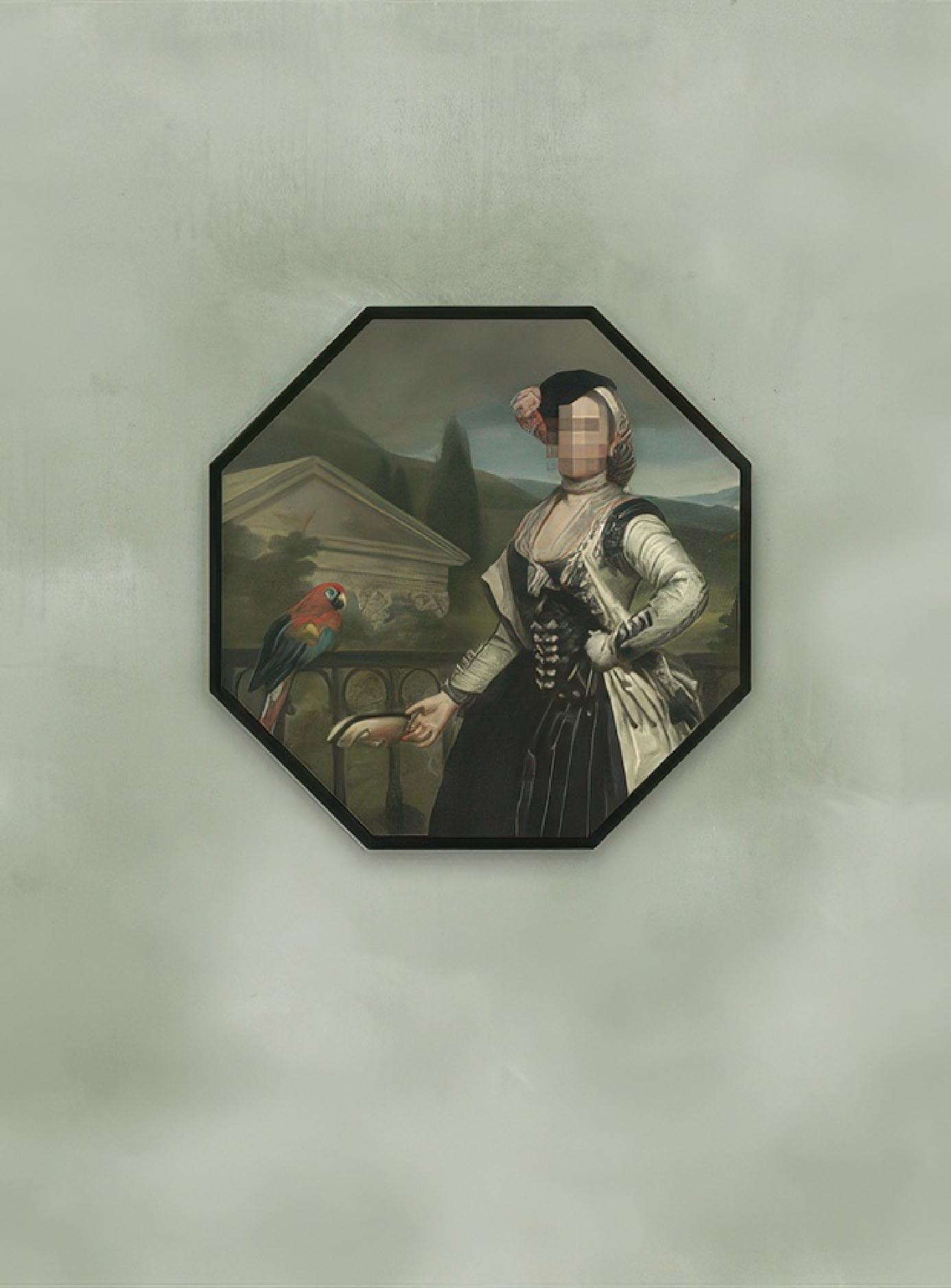 This work represents a juxtaposition between classical portraits and the present digital age we live in by keeping the subject’s face veiled under a mask of pixels. A classical artwork with a contemporary twist.